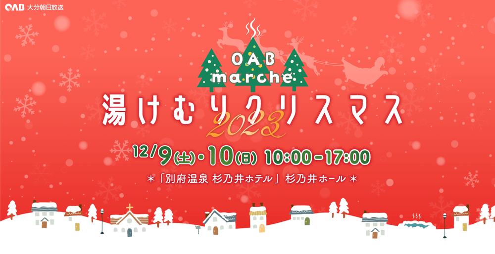 「OABマルシェ 湯けむりクリスマス2023」2023年12月9日(土)10日(日)10:00〜17:00@別府温泉杉乃井ホテル 杉乃井ホール 県内最大級の披露宴会場を舞台に県内外の人気店がずらりと並びます。 https://www.oab.co.jp/event/marche/christmas2023.html